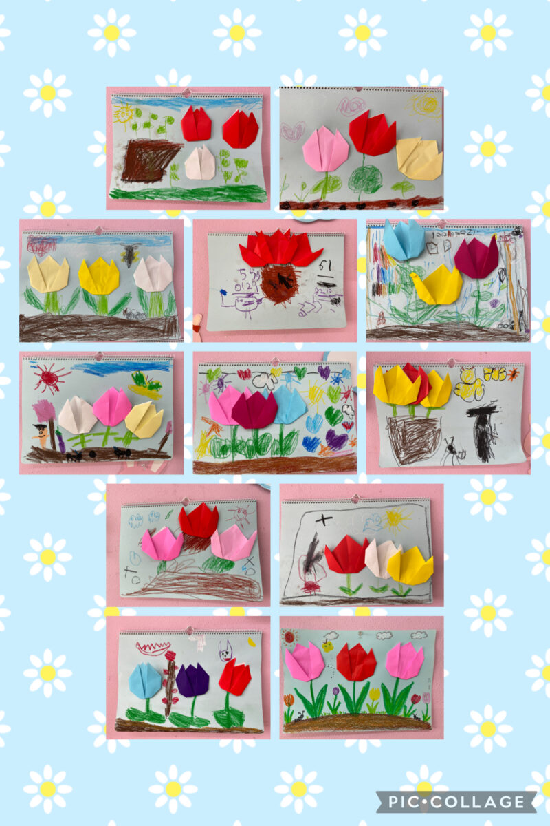 〜できました٩( ᐛ )و お部屋の中はパッとチューリップ🌷畑一面、初めての製作帳完成に笑顔が溢れていました〜