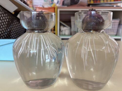 梅組 観察画 10.17 梅組 2025.10.182025.10.20 今日は朝から外遊び☀️ ジャングルジムに登ったり、ブランコをしたり、滑り台を滑ったり。 思い思いに遊びを楽しみました♪ 主活動では、観察画ヒヤシンス『根が出た』を描きました。 土がなくても、水で育つという気づきがありました♡ ヒヤシンスの成長を楽しみにしている子どもたちでした✨