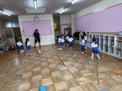 梅組 正課体操🏃♀️10.22 梅組 2025.10.23 久しぶりの正課体操でした🤸 今日は初めて縄跳びを使って活動していきました。 縄跳びを蛇のように揺らしてみたり ズボンに入れて尻尾にしてみたり 縄跳びに親しみが持てるよう、指導していただきました^ ^ その後は縄を回すことに挑戦! 後ろから前に持ってくるのが難しく、苦戦していた子どもたちでしたが真剣に取り組む姿が見られました♪ 午後はお部屋で体操して体を動かしたり、じゃんけん列車をしました💙 じゃんけんでも、後出ししてしまう子が少しずつ減ってきました✨