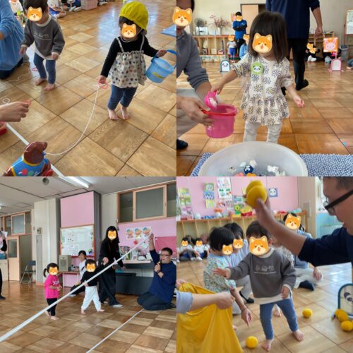玉入れは、先生が引っ張る箱にみんな頑張って入れてくれました。