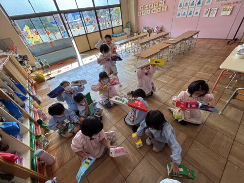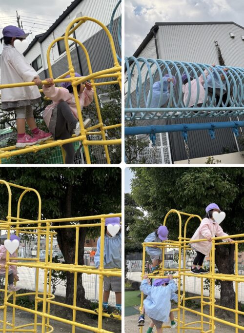 梅組 ジャングルジム 11.17 梅組 2025.11.172025.11.19 朝のローテーションで、ジャングルジムに挑戦しました✨ みんなで行うのは初めてで、小さな体で一生懸命ジャングルジムを上っていく子どもたちに驚きでした❗️ 苦手な子も、得意な子もいる中で、応援したり応援されたり。 いろんなことに挑戦して経験を重ねている子どもたちです🤍 お昼からは新幹線の最後の仕上げ♪ 念願の!新幹線🚄 連結できるようになり大興奮^ ^ 完成させた新幹線で楽しく遊びました✨