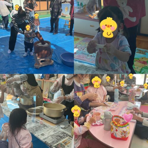 まずは、園庭で大人がお餅つきをするのを見学してから、