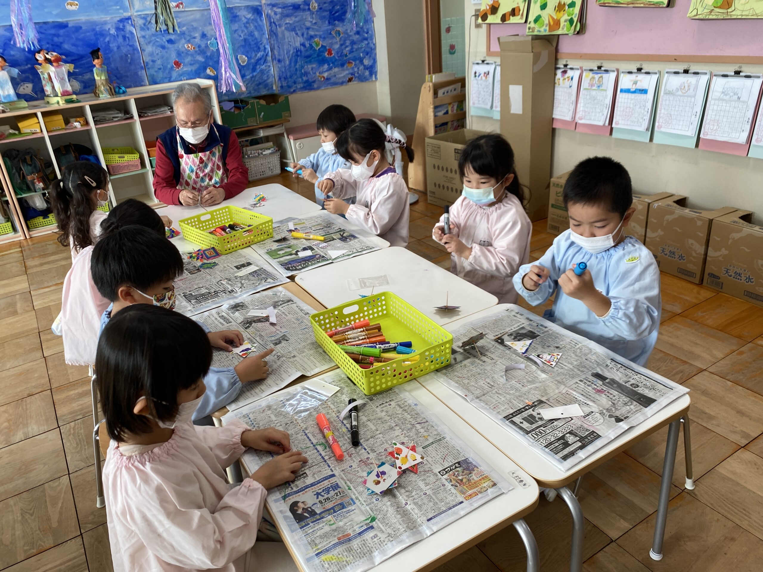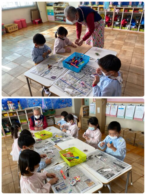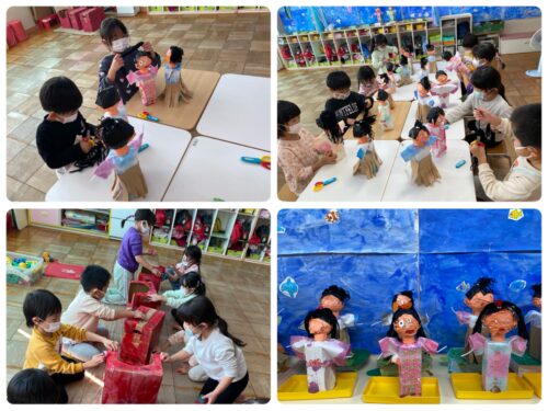 💚松組・11月★あとりえ(コマ作り) 松組 2025.11.28 今日はあとりえ授業🎨 工作は『 コマ作り 』 土台となるコマにデザインをして作り上げていきました♪ 指先を使いながら ミニゴムを調整しながら カラフルのコマが完成しました🎵 お昼からは作品作り乙姫様や浦島太郎が✨ 🎵初めての経験に頑張る子どもたち 🎵とっても集中する子どもたち 🎵何か一つ完成した時には笑顔いっぱい 🎵今日も楽しかった 💕お部屋の中がたのもしくなって来ました 🔰写真掲載は保護者様の許可を得ています