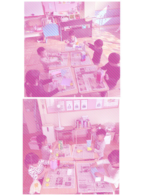 今日は鍵盤ハーモニカの練習を行ったあと、共同製作で『いかの足』を作りました。何種類かの好きな色の折り紙を選び、牛乳パックに貼り付けていきました。カラフルないかが出来上がるのが楽しみです🩷