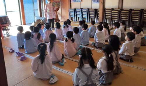 菊組 12/8 成道会 菊組 2025.12.08 本日12/8は『成道会(じょうどうえ)』 お釈迦様が悟りを開かれた日です🙏 お隣のお寺の本堂へお参りに行きました。本堂に行くと、キリっとした表情になる子どもたち。 お釈迦様の紙芝居や掛け軸を集中して見ることが出来ました。 部屋に戻り、『甘茶』をいただきました😃まずは匂いを嗅いでみました。『甘い匂い』と答える子が多くいましたが、『酸っぱい匂い』と答える子もいました。 ゴクゴクと甘茶を飲み、おかわりをする子や一口だけ飲む子など、様々な姿が見られました。