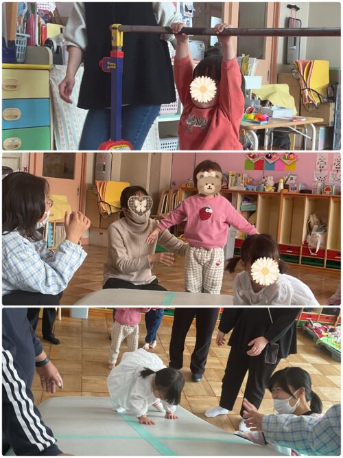 マットや鉄棒では、興味の向くままにやりたいことにどんどん挑戦して、元気に体を動かせました。