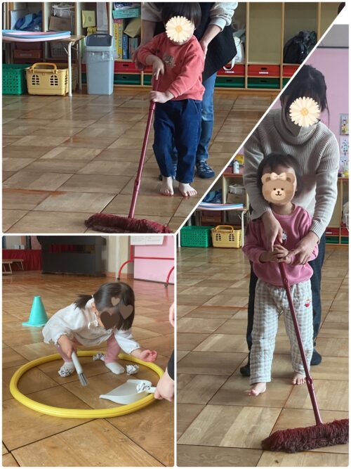 ほうきで掃いたりモップをかけたり、こんなことも子どもたちには遊びになりますね。