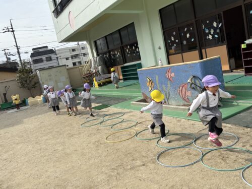 外遊びの時間では、けんけんぱを練習中の子どもたちです!